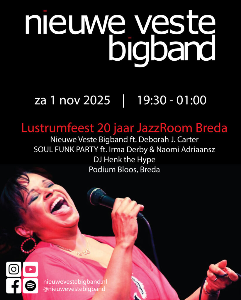 Op 1 november 2025 speelt de Nieuwe Veste Bigband op het 20 jarige lustrumfeest van Stichting JazzRoom Breda met niemand minder dan Deborah J. Carter als gastvocaliste. Het belooft een geweldige avond te worden waarbij gasten ook kunnen genieten van SOUL FUNK PARTY ft. Irma Derby en Naomi Adriaansz en de afterparty met DJ Henk the Hype.